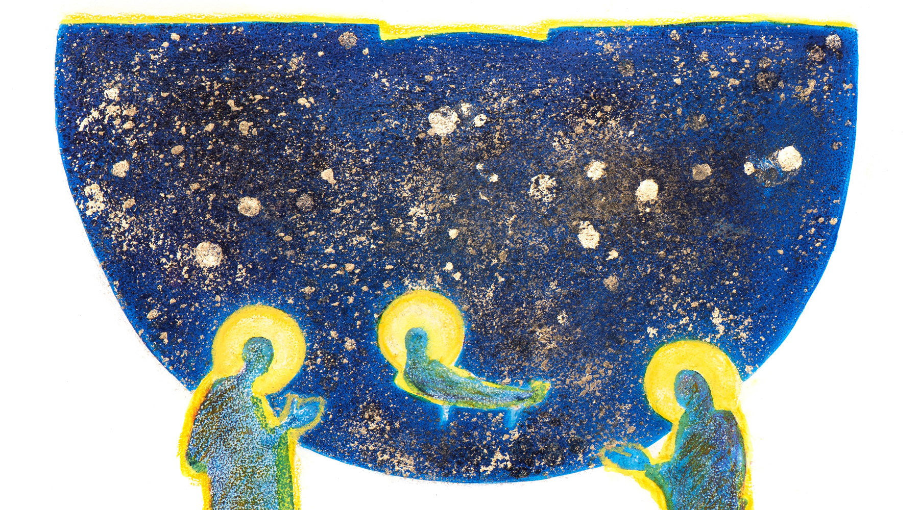 Die Wiederholung des göttlichen Kreises um den Sternenhimmel legt nahe, dass dieser eine göttliche Schöpfung ist, ein Sichtbar-Werden seiner Herrlichkeit. Der Künstler wandelt den Sternenhimmel zur überdimensionalen, aber äußerst kostbaren und damit würdevollen Wiege für Jesus. Von oben nach unten betrachtet wird sichtbar, dass der allmächtige Gott Mensch geworden ist und sich den Menschen in die Hände gegeben hat. So schwebt das Kind fast verloren in der Tiefe des Halbrunds der großen Himmelsschale, wären da nicht die beiden Gestalten, die durch ihre Kleidung und leuchtende Aura Jesus zugeordnet sind.