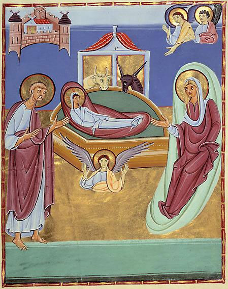 – Maria, Josef und das Christkind aus dem “Perikopenbuch (Evangelistar) Heinrichs II.”, Kloster Reichenau, 1007 — 1012, München, Bayrische Staatsbibliothek, Signatur Clm 4452